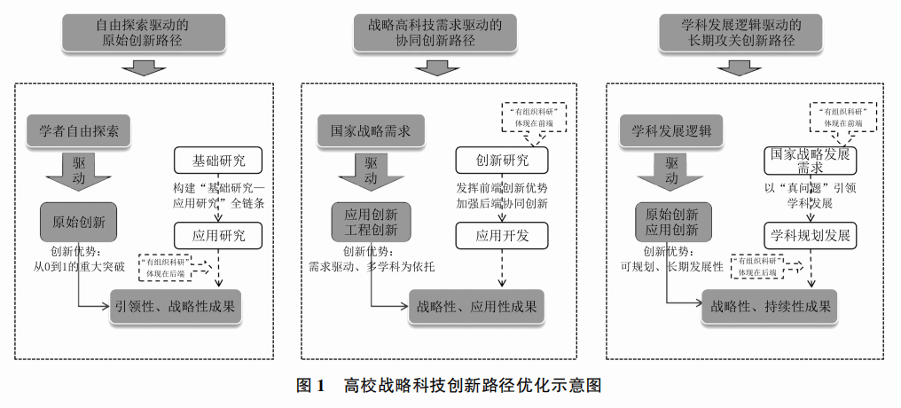 一般来说,战略科技创新的驱动力主要来自三个方面:自由探索、战略高科技需求、学科发展逻辑。与此相应,高校战略科技创新路径主要有三条(图1)。一是自由探索驱动的原始创新路径,其创新的主要动力是学者的自由探索,因此这条路径的特点是成果的不确定性以及不可预期性。但是应该看到,自由探索是科学研究的重要特征之一,是人类得以不断进步的原动力,因此不能简单粗暴干预。对于这条路径,战略科技的“有组织性”应该体现在后端,即能够发现并挖掘出自由探索的基础研究价值,并通过应用基础研究、应用开发研究等一系列环节将原创成果技术化、产业化,因此这一创新路径优化的关键是构建起从基础研究到应用研究全过程的链条。二是战略高科技需求驱动的协同创新路径,其创新的主要动力来自国家的战略需求,因此这条路径的特点是需求驱动和以多学科为依托。但也应该看到,高校在应用开发、工程化、产业化等方面不具备优势,优势在创新的前端,后端则需要跟科研院所、科技领军企业等紧密合作,因此,这一创新路径优化的关键是构建起协同创新的路径和机制。三是学科发展逻辑驱动的长期攻关创新路径,其创新动力主要来自学科知识自身的发展逻辑,因此这条路径的特点是其发展逻辑与国家战略需求并不总是相一致。学科发展逻辑的优势在于其可规划性和长期发展性,因此这一创新路径优化的关键是以真问题(国家战略发展需求)引领学科规划和发展,建立长期攻关的创新路径。