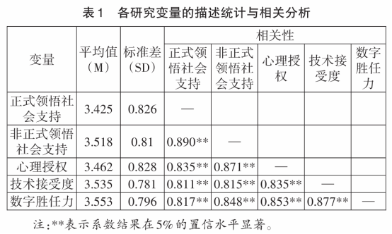 根据表1中的描述性统计与相关系数值,领悟社会支持和数字胜任力的均值都相对较高,尤其是非正式领悟社会支持均值高达3.518,表明高校教师对非正式社会支持有较高的认同感。同时,技术接受度的均值为3.535,说明高校教师认可数字技术对教学和科研工作具有一定的价值和易用性。进一步观察变量间相关关系,正式与非正式领悟社会支持、心理授权、技术接受度与数字胜任力均显著正相关(p<0.01)。以上分析结果初步验证了正式与非正式领悟社会支持均能显著影响高校教师数字胜任力,但具体的影响贡献力及路径仍需进一步检验。