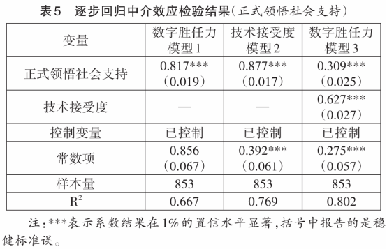 假设5:技术接受度在正式领悟社会支持与高校教师数字胜任力之间起中介作用;