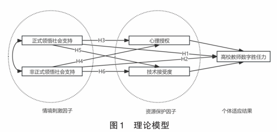 领悟社会支持作为个体对于外部资源的心理表征,往往决定了个体是否会积极、主动地利用资源,进而影响其工作满意度、创新行为及专业胜任力等诸多方面。基于此,结合高校教师数字化发展实际情境,本研究侧重于探究领悟社会支持对高校教师数字胜任力的作用机制,并进一步将其概念化为“正式领悟社会支持”与“非正式领悟社会支持”。一方面,正式领悟社会支持侧重于传统社会交往。高资源禀赋院校提供的组织支持与便利条件更能使教师产生认同感,有助于教师迅速适应数字化转型进程;另一方面,非正式领悟社会支持则强调通过社会网络对教师数字化发展产生影响,如校长、同事等重要他人能够使教师获得情感鼓励或信息启示,进而增强教师对数字化转型的适应力。综上,提出以下研究假设: