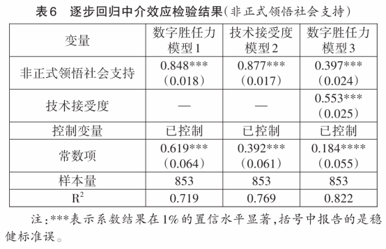 假设6:技术接受度在非正式领悟社会支持与高校教师数字胜任力之间起中介作用。