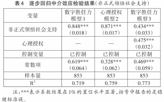 假设4:心理授权在非正式领悟社会支持与高校教师数字胜任力间起中介作用。