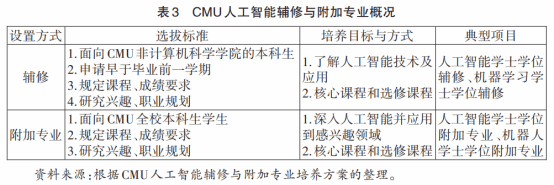 针对人工智能附加专业而言,一方面,CMU定向人工智能本体、人机交互、机器人学等领域推出三种人工智能附加专业;另一方面,人工智能附加专业不仅旨在满足学生对人工智能领域学识的系统化学习诉求,还进一步追求发展学生人工智能跨学科应用的能力。鉴于此,相较于人工智能辅修,附加专业选拔标准和课程学习要求更严格。如学生辅修人工智能学士学位需先修课程成绩达到C+且完成至少100学分的课程学习。而人工智能学士学位附加专业要求学生先修课程达到B且完成至少204学分的课程学习。