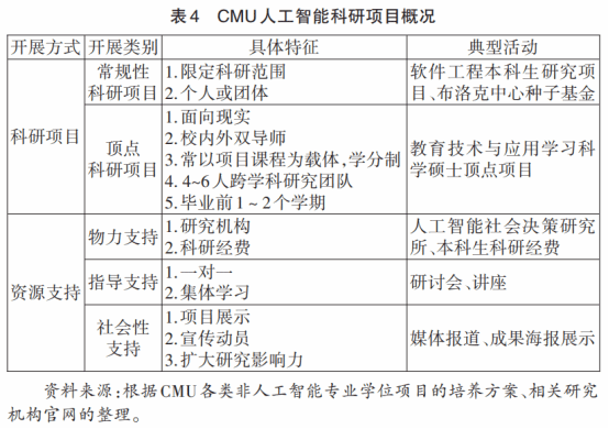 CMU通过人工智能科研项目构建一个集协同化和个性化于一体的人工智能素养培养场域,在科研训练中促进学生人工智能知识、情感与思维的贯通化与实践化。CMU以多类型科研支持为保障,既推行人工智能领域的常规性科研项目,还重视其特有的顶点科研项目。总体而言,其人工智能科研项目以增进社会福祉为导向、强调跨学科合作的力量,是CMU研究生人工智能素养培养的重要路径。(见表4)